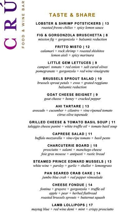Restaurantfoodmenu is an online guidance for Cru Wine Bar menu providing prices information of Cru Wine Bar breakfast specials kids value menu. Conceived as an exciting urban destination to experience and explore the fascinating world of wine with over 300 wine selections and 40 premium wines offered by the glass as well as taster pairings and wine flights. Calamari shrimp white truffle aioli spicy.